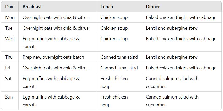 By adjusting the portion sizes to match storage safety, you’re now preparing meals only for 3 days at a time, ensuring freshness and minimizing food waste. Meals like chicken thighs, lentil stews, and soups can easily be frozen or refidgerated, and reheated, and breakfast items like overnight oats or egg muffins stay good for up to 3 days. This also simplifies the preparation without needing to cook every day, keeping your meals simple, cost-effective, and convenient!